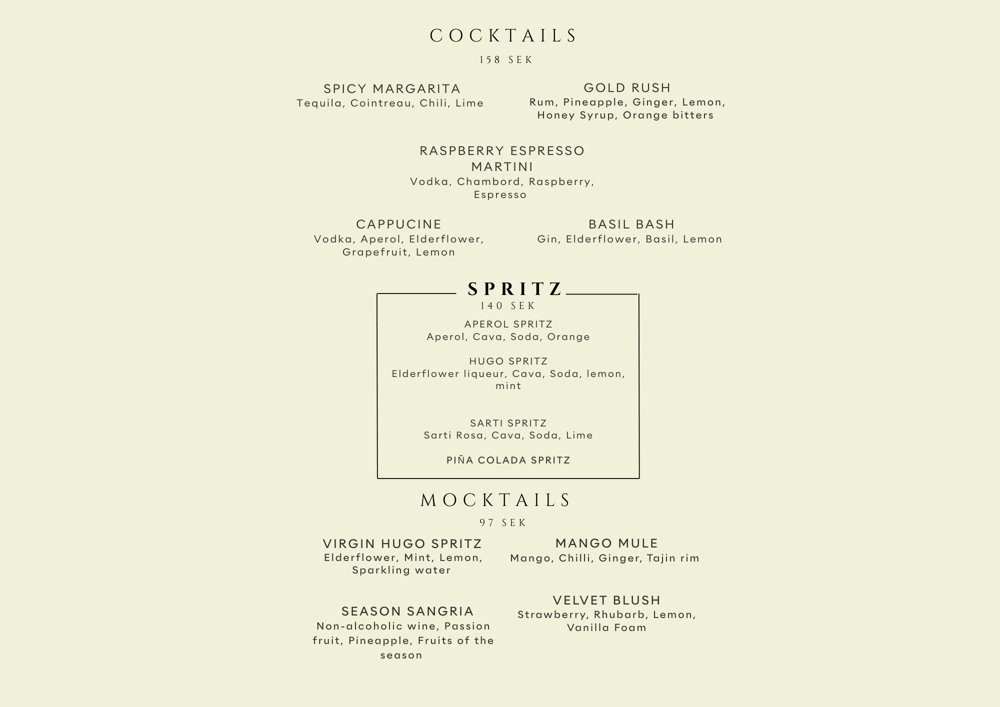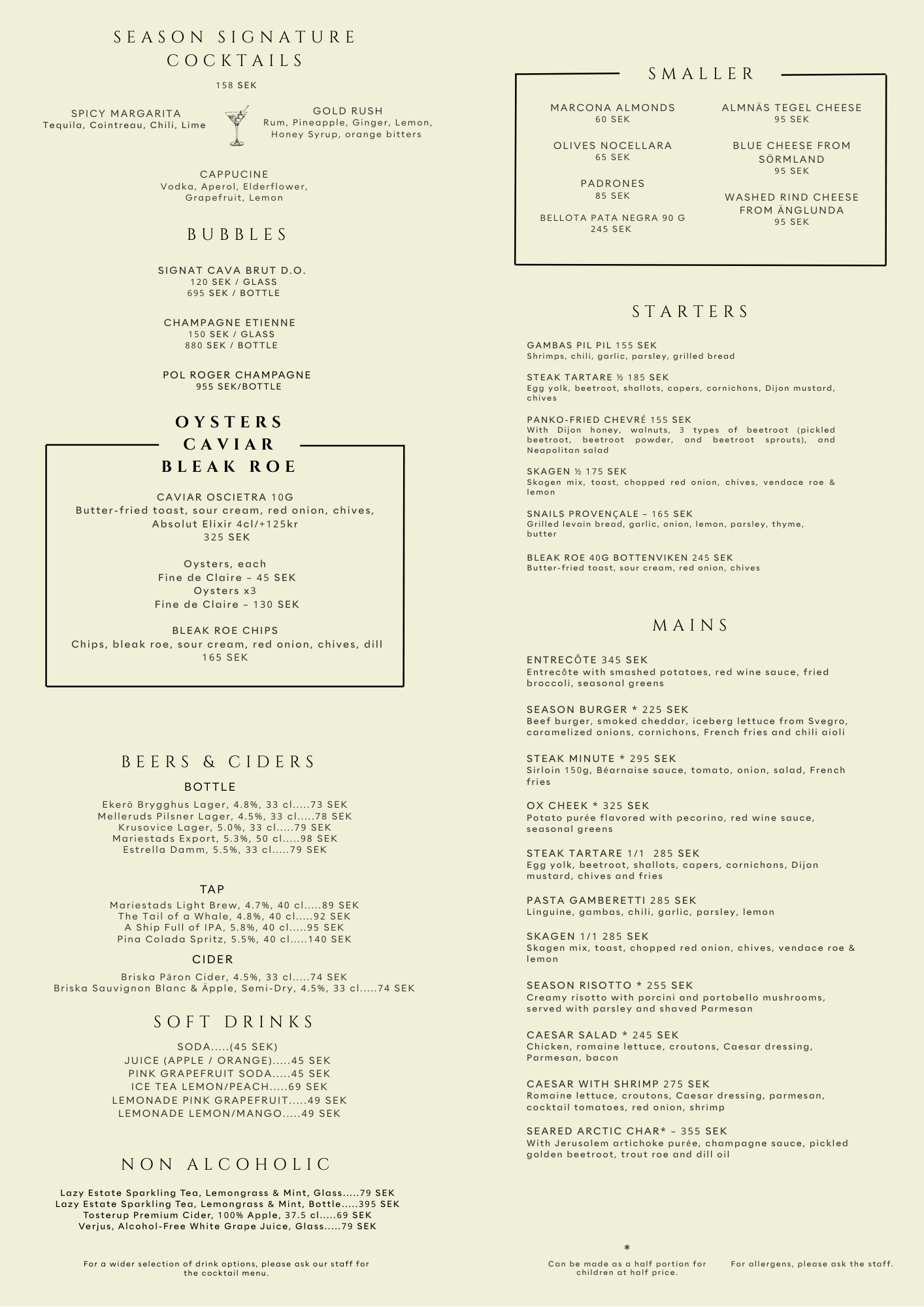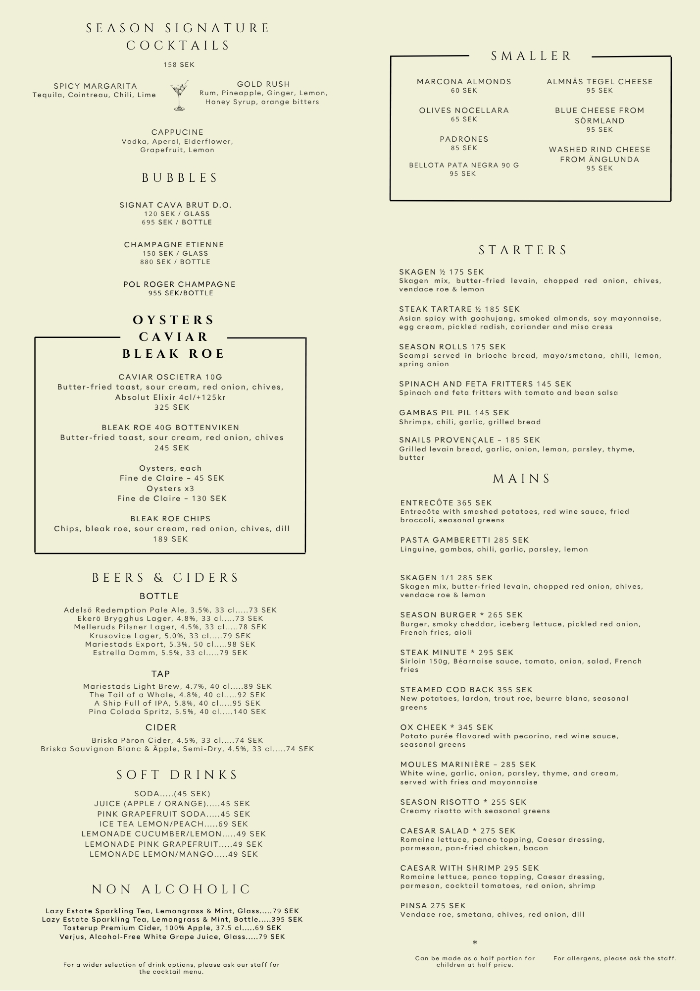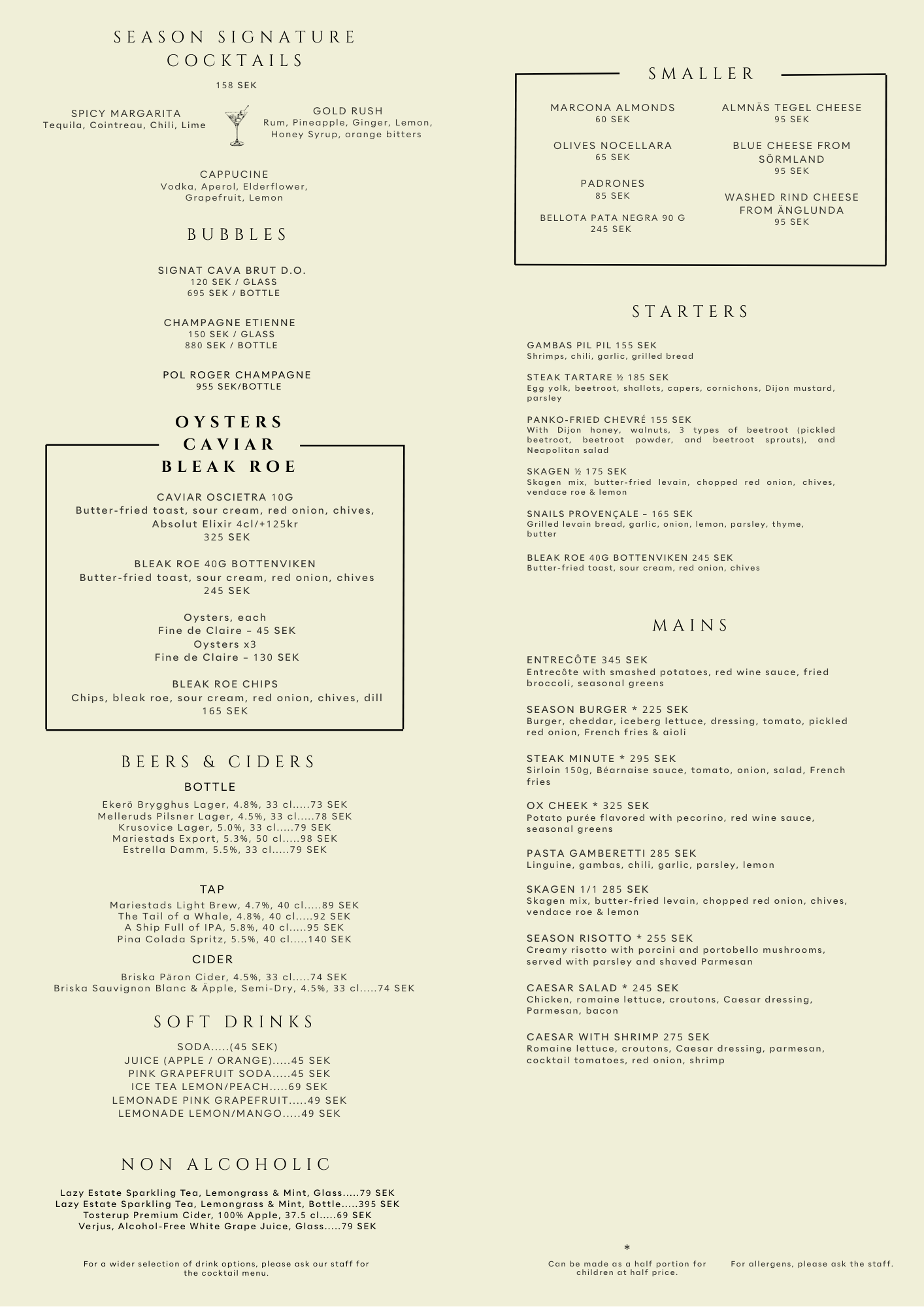 For any allergens, feel free to contact us at brasserie@seasonhotel.se or ask our staff on site.