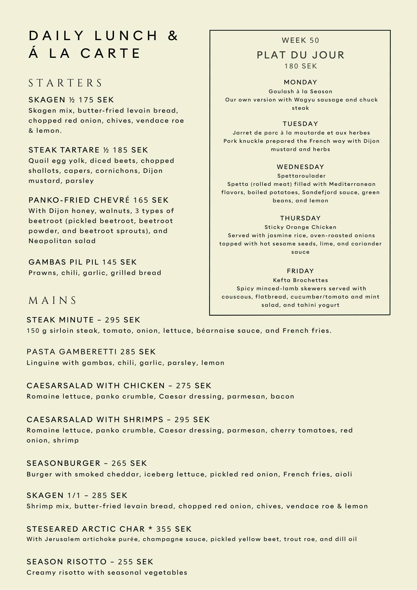 To keep things fresh, we also present a daily plat du jour served with a smaller salad and a daily soup – giving you something new to discover every visit, while staying true to the familiar feeling.